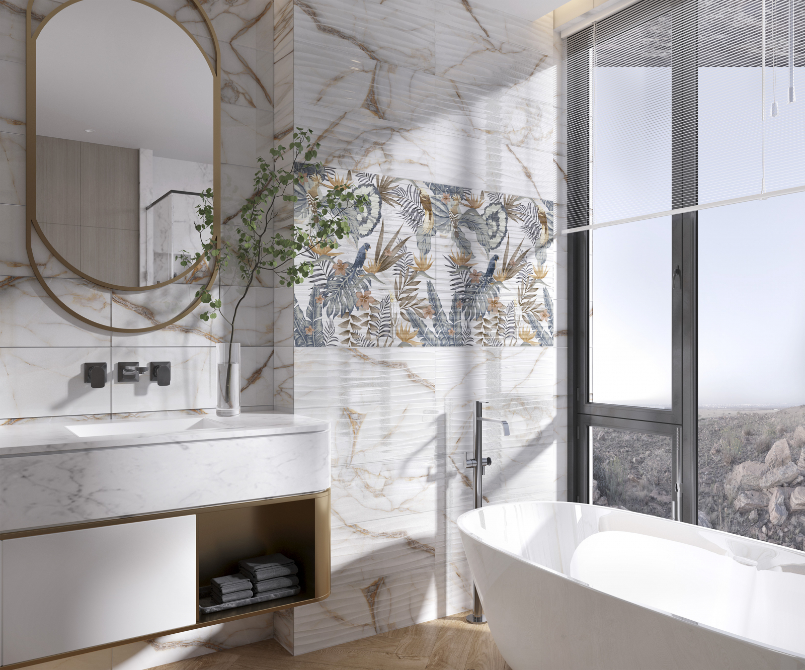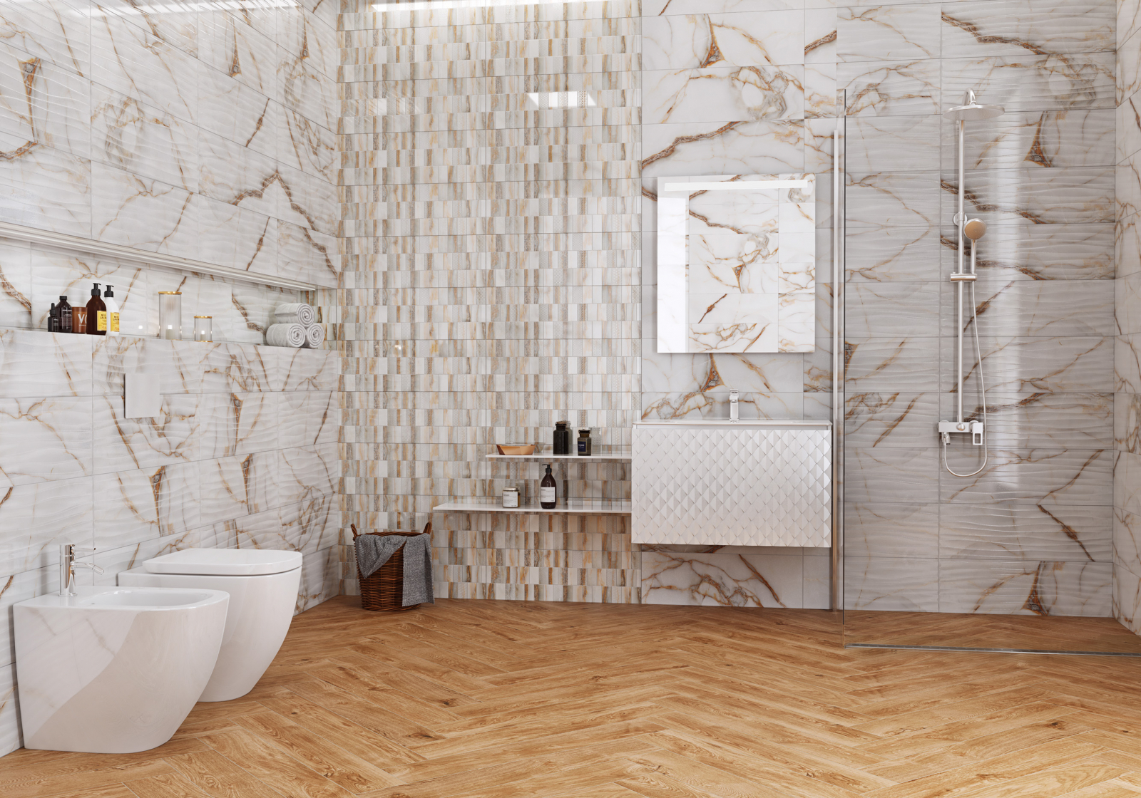 Faianta rectificata tip marmura, Goldie Onda White 4992, 24.4x74.4 cm, alb, finisaj lucios
