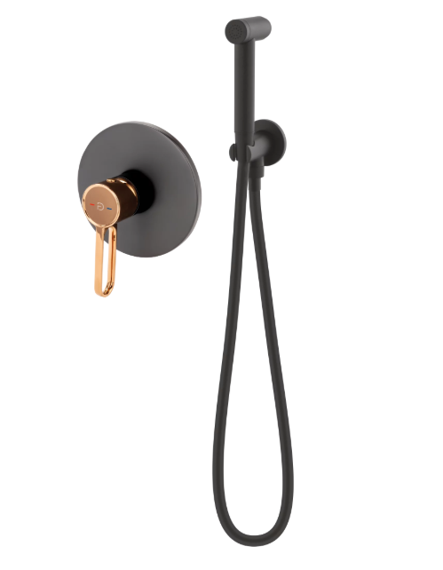 Descoperă eleganța și funcționalitatea setului de duș igienic cu baterie încastrată din colecția ZAFFIRO, finisat într-o combinație sofisticată de black rose gold. Acest set aduce un aer de lux și modernitate în orice baie, fiind ideal pentru cei care doresc să adauge un accent de rafinament spațiului lor. Designul încastrat al bateriei asigură un aspect curat, integrându-se perfect în perete pentru a economisi spațiu și a oferi o estetică ordonată. Combinația de negru mat cu roz auriu nu doar că oferă un contrast vizual plăcut, dar adaugă și o notă de glamour subtil, transformând setul de duș igienic într-un element decorativ în sine.